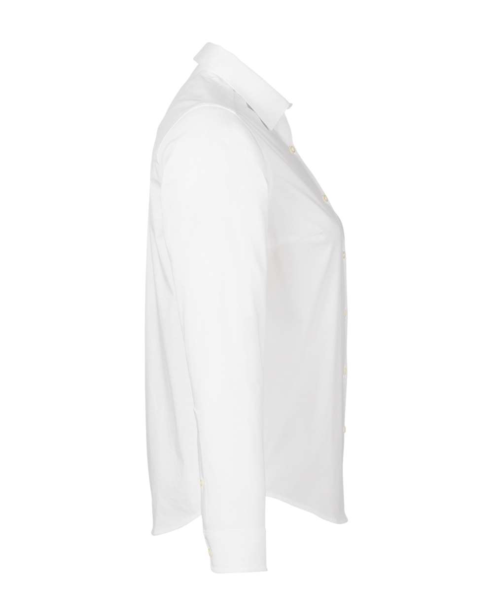 The Devon & Jones CrownLux Performance® Ladies' Spencer Poplin Shirt (DG505W) is a women's long-sleeve dress shirt designed for comfort and performance. It is made from a 4 oz/yd² (143 gsm) brushed woven fabric blend of 59% cotton, 39% polyester, and 2% spandex, providing moisture-wicking properties and stretch for an enhanced fit and unrestricted movement.