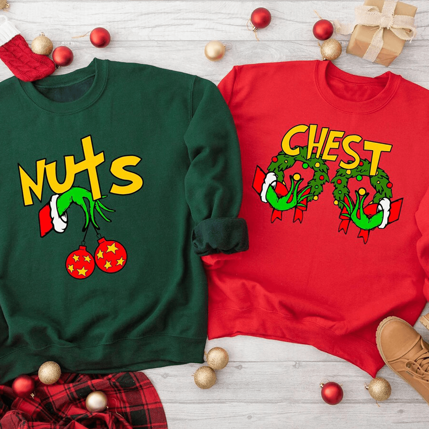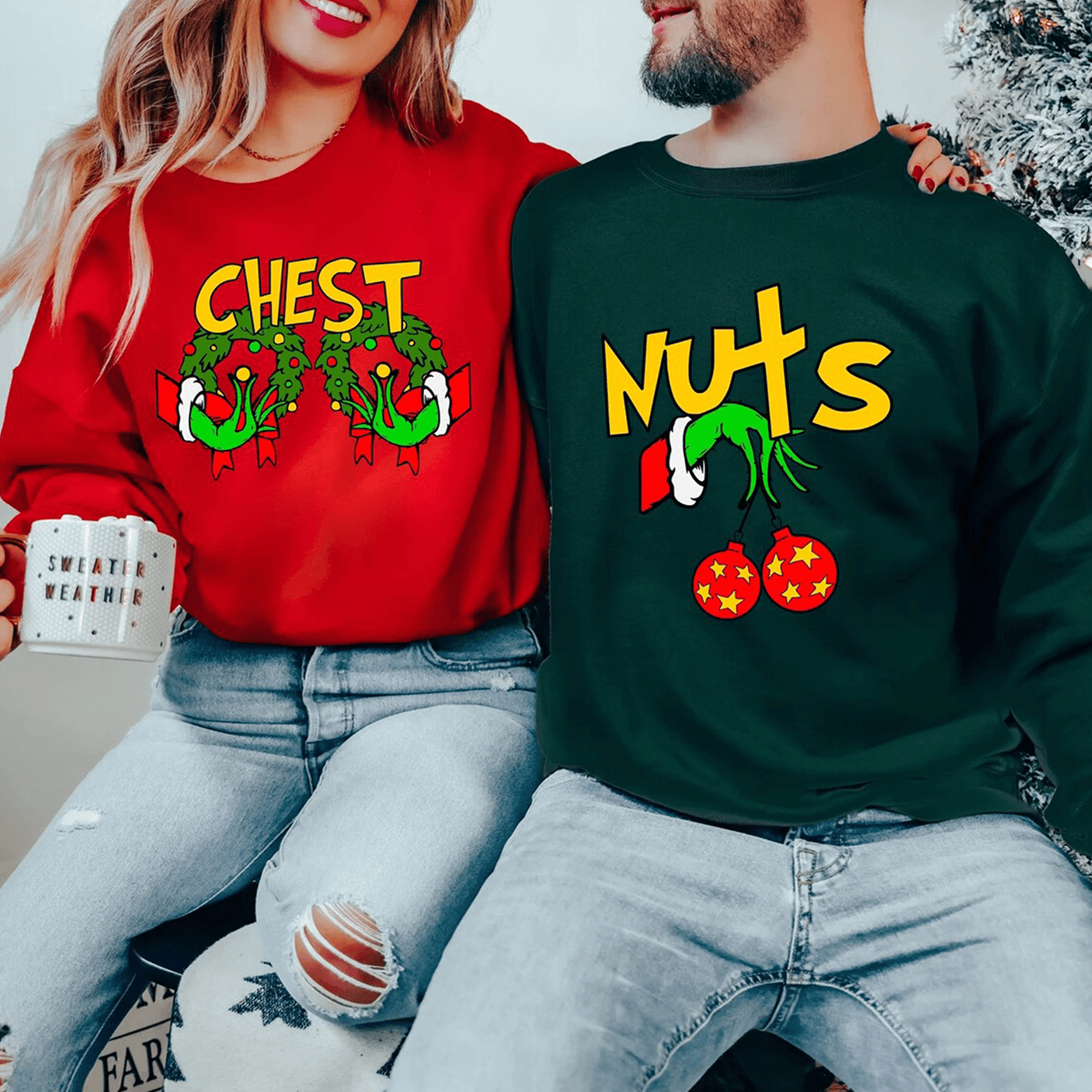 Ajoutez une touche d'humour effronté à la période des fêtes avec notre Pulls pour couples Chest Nuts! Idéal pour les couples qui aiment garder les choses légères, cet ensemble assorti présente un design amusant inspiré des jeux de mots qui ne manquera pas d'apporter rires et joie de vivre. Fabriqués dans un tissu doux et confortable, ces pulls sont idéaux pour les soirées douillettes, les réunions de vacances ou pour capturer ces photos de Noël mémorables ensemble.